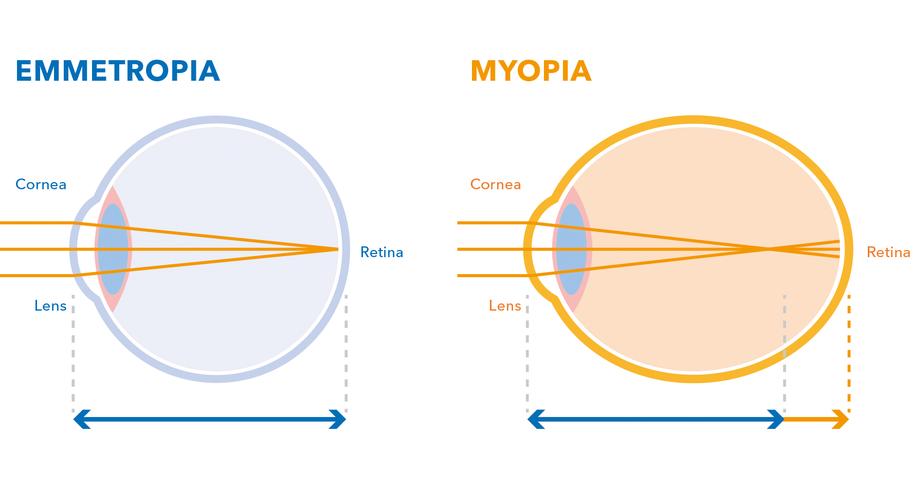 Myopia is a common eye condition (refractive error) that causes blurry vision when looking at distant objects (e.g.: TV, blackboard, traffic signals). Near vision is normally preserved.