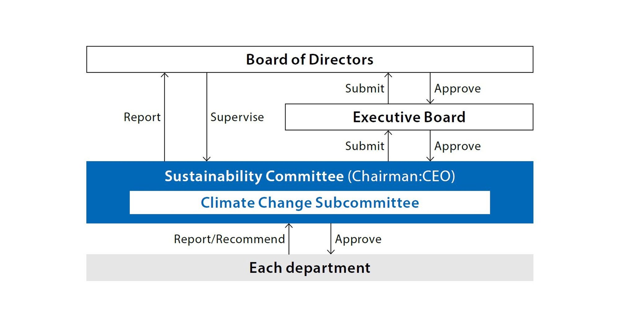 The Menicon Group discusses issues related to climate change at the Sustainability Committee and determines the basic action policies. The Sustainability Committee is led by our CEO, and consists of all our executive officers, internal directors, and heads of related departments. They are scheduled to meet more than four times a year. We have also set up a subcommittee on climate change issues which collects information from each department and review the contents to be discussed by the Sustainability Committee, such as evaluating risks and opportunities related to climate change and initiatives to address issues, as necessary. Among the content discussed in the Sustainability Committee, measures and policies that will have impacts on management will be approved by the Executive Committee and Board of Directors. Other matters which were discussed are also regularly reported to the Board of Directors. Sustainability management is promoted under the supervision of the Board of Directors.