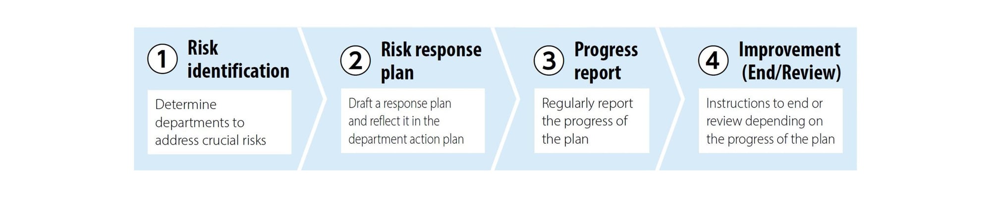 The Sustainability Department collects information on the company’s response to internal and external environmental changes from each department more than once a year. The department then sorts out the identified risks, and the committee chairman determines the important risks after deliberation by the Sustainability Committee. - Risk response plan